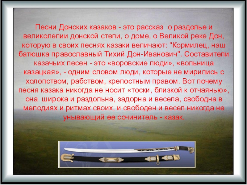 Слайд 13Песни Донских казаков - это рассказ о раздолье и великолепии донской