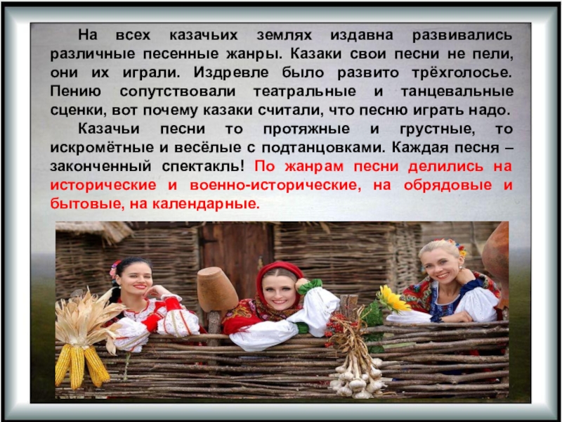 Слайд 12 На всех казачьих землях издавна развивались различные песенные жанры. Казаки свои