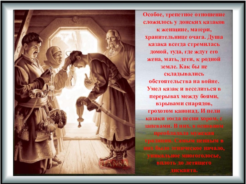 Слайд 15Особое, трепетное отношение сложилось у донских казаков к женщине, матери, хранительнице