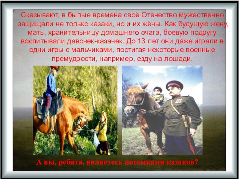 Cказывают, в былые времена своё Отечество мужественно защищали не только казаки, но и их жёны. Как будущую жену, мать, хранительницу домашнего очага, боевую подругу воспитывали девочек-казачек. До 13 лет они даже играли в одни игры с мальчиками, постигая некоторые военные премудрости, например, езду на лошади.