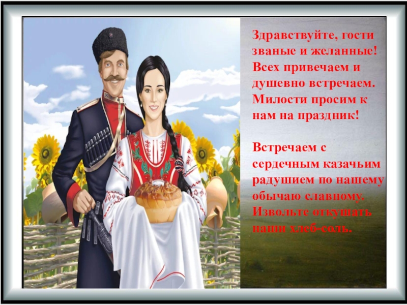 Встречаем с сердечным казачьим радушием по нашему обычаю славному. Извольте откушать наши хлеб-соль.