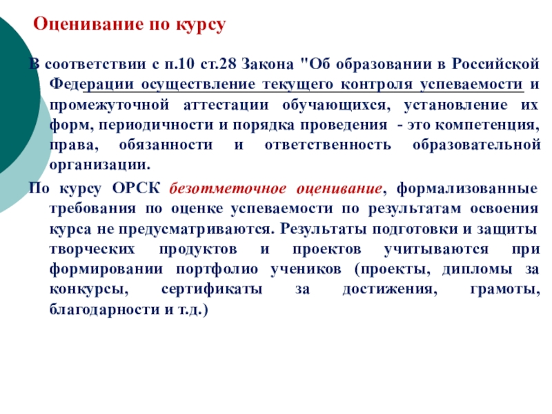 По курсу ОРСК безотметочное оценивание, формализованные требования по оценке успеваемости по результатам освоения курса не предусматриваются. Результаты подготовки и защиты творческих продуктов и проектов учитываются при формировании портфолио учеников (проекты, дипломы за конкурсы, сертификаты за достижения, грамоты, благодарности и т.д.)