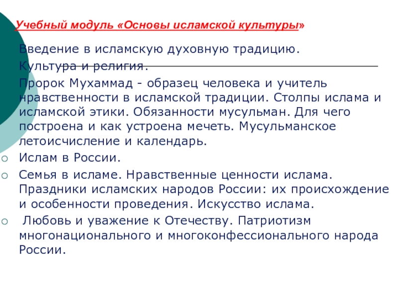 Слайд 8Учебный модуль «Основы исламской культуры»
