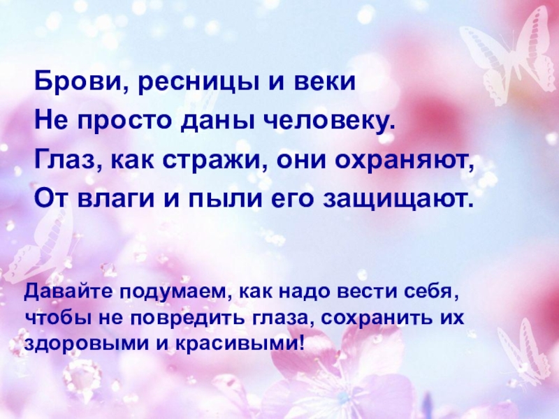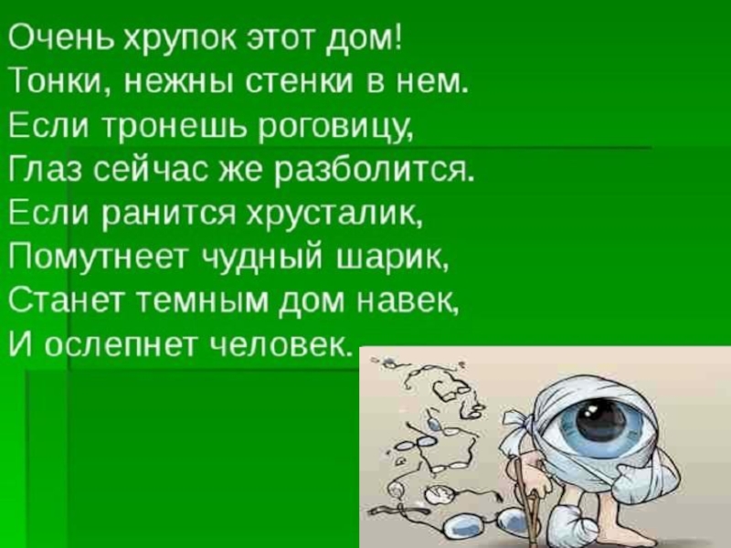 Давайте подумаем, как надо вести себя, чтобы не повредить глаза, сохранить их здоровыми и красивыми!