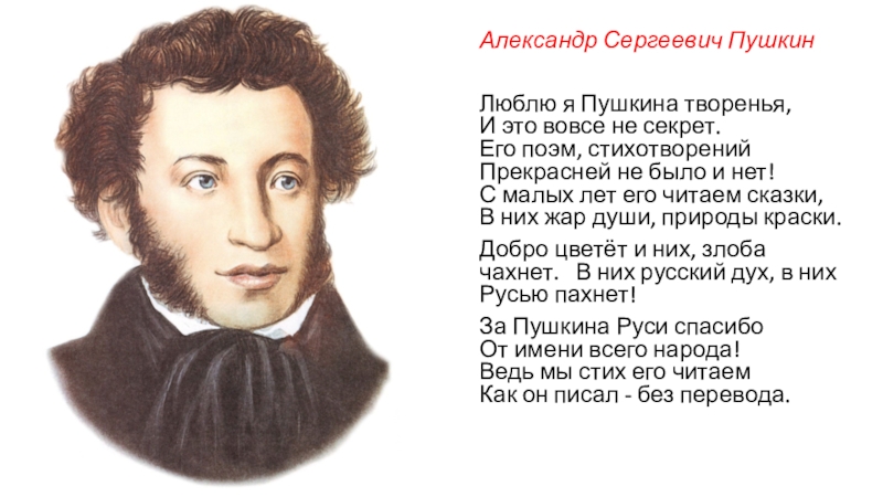 Александр Сергеевич ПушкинЛюблю я Пушкина творенья, И это вовсе не секрет. Его поэм, стихотворений Прекрасней не было и