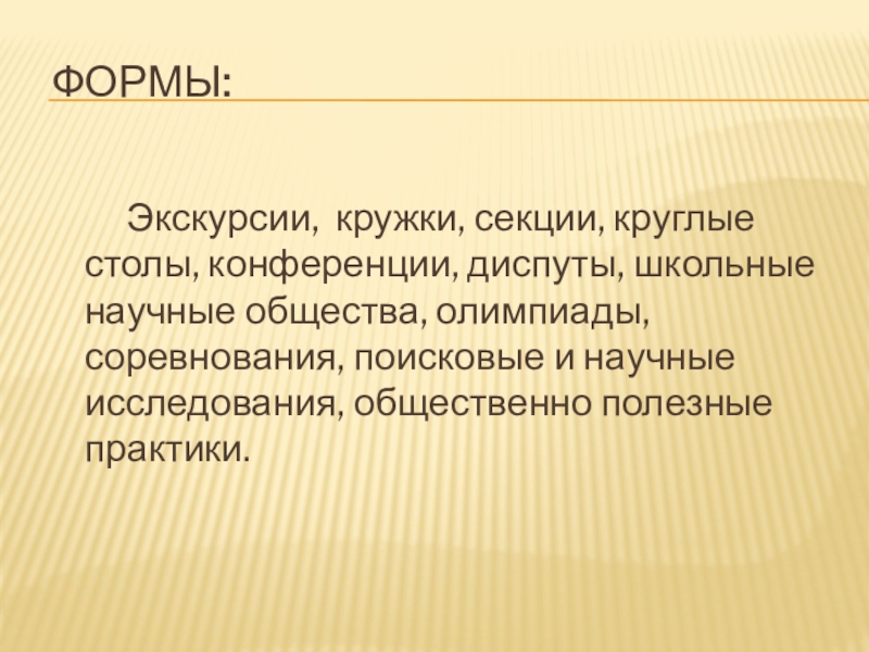 Формы:     Экскурсии, кружки, секции, круглые столы, конференции, диспуты, школьные научные общества, олимпиады, соревнования,