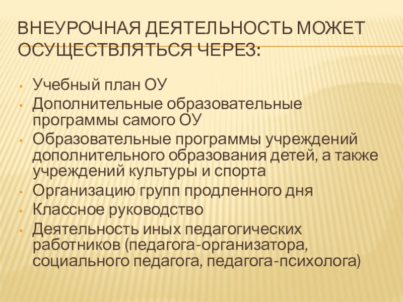 Внеурочная деятельность может осуществляться через:Учебный план ОУДополнительные образовательные программы самого ОУОбразовательные программы учреждений дополнительного образования детей, а