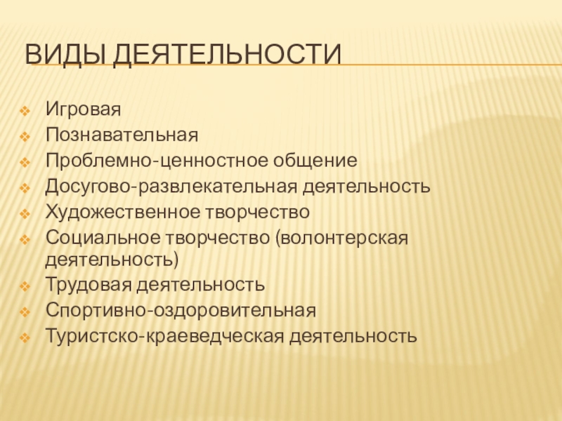 Виды деятельностиИгроваяПознавательнаяПроблемно-ценностное общениеДосугово-развлекательная деятельностьХудожественное творчествоСоциальное творчество (волонтерская деятельность)Трудовая деятельностьСпортивно-оздоровительнаяТуристско-краеведческая деятельность