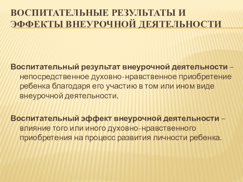 Воспитательный эффект внеурочной деятельности – влияние того или иного духовно-нравственного приобретения на процесс развития личности ребенка.