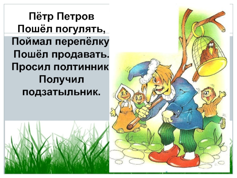 Пётр ПетровПошёл погулять,Поймал перепёлку,Пошёл продавать.Просил полтинник,Получил  подзатыльник.
