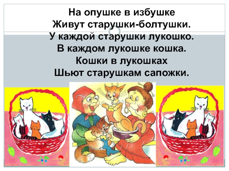 На опушке в избушкеЖивут старушки-болтушки.У каждой старушки лукошко.В каждом лукошке кошка.Кошки в лукошкахШьют старушкам сапожки.
