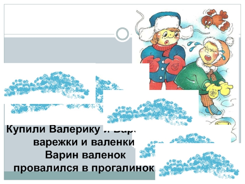 Купили Валерику и Варенькеварежки и валенки.Варин валенокпровалился в прогалинок.