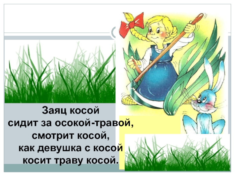 Заяц косойсидит за осокой-травой,смотрит косой,как девушка с косойкосит траву косой.