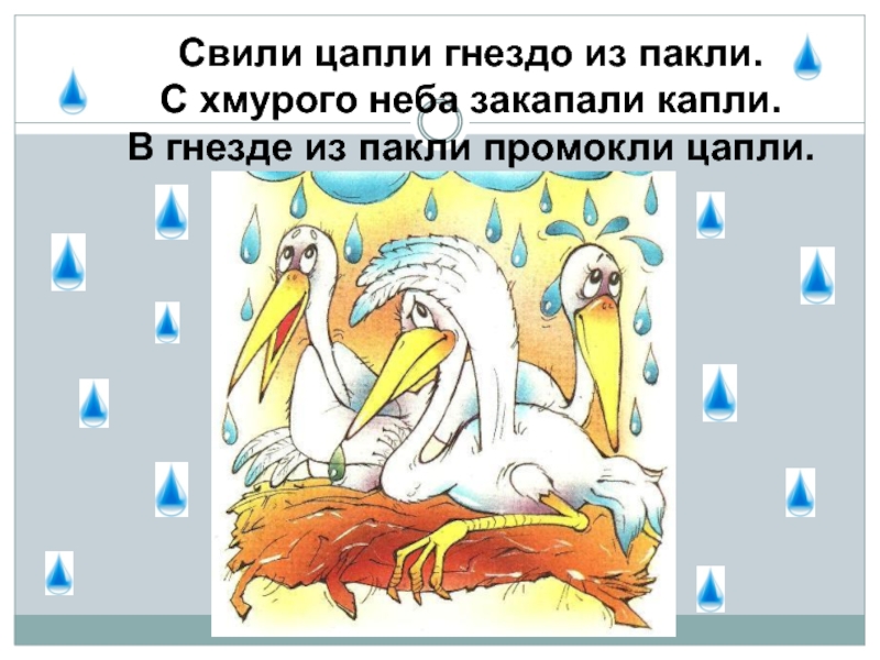 Свили цапли гнездо из пакли.С хмурого неба закапали капли.В гнезде из пакли промокли цапли.