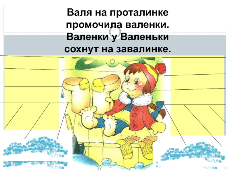 Валя на проталинкепромочила валенки.Валенки у Валенькисохнут на завалинке.
