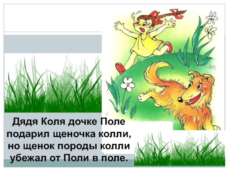Дядя Коля дочке Полеподарил щеночка колли,но щенок породы коллиубежал от Поли в поле.