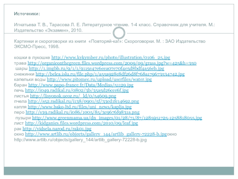 Слайд 37Источники: Игнатьева Т. В., Тарасова Л. Е. Литературное чтение. 1-4 класс. Справочник