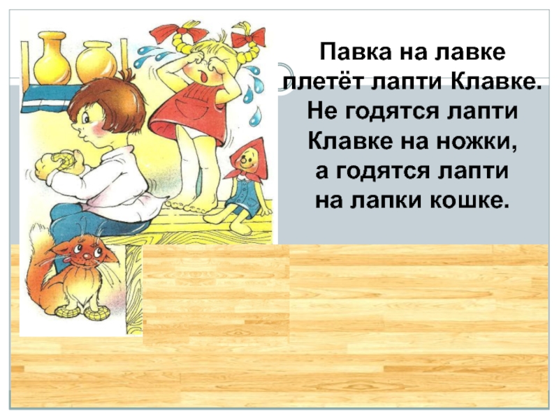 Павка на лавкеплетёт лапти Клавке.Не годятся лаптиКлавке на ножки,а годятся лаптина лапки кошке.