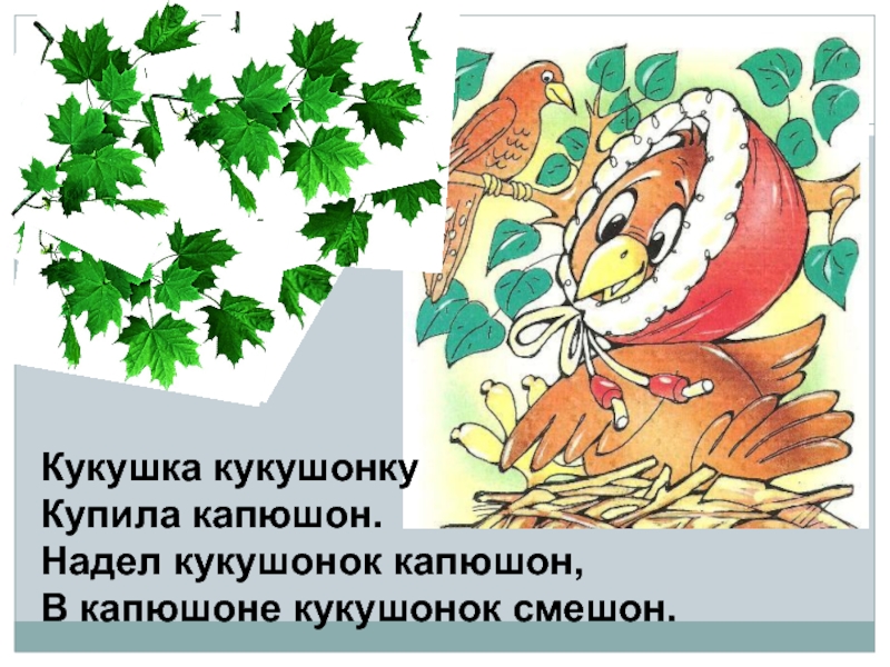 Кукушка кукушонкуКупила капюшон.Надел кукушонок капюшон,В капюшоне кукушонок смешон.