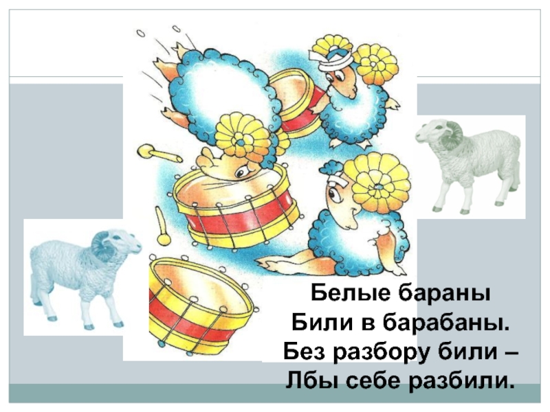 Белые бараныБили в барабаны.Без разбору били –Лбы себе разбили.