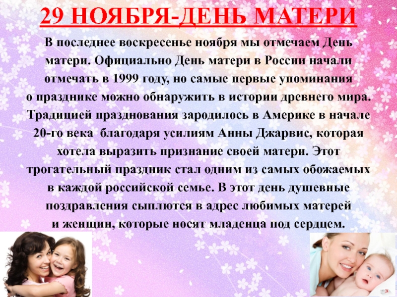 29 НОЯБРЯ-ДЕНЬ МАТЕРИ  В последнее воскресенье ноября мы отмечаем День матери. Официально День матери в России начали