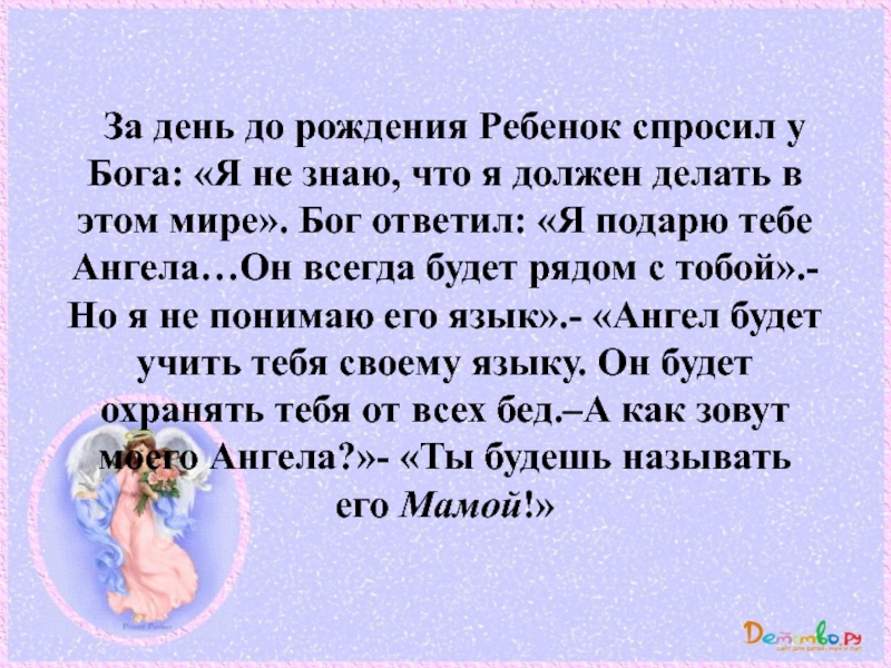 знаю, что я должен делать в этом мире». Бог ответил: «Я подарю тебе Ангела…Он всегда будет рядом с тобой».- Но я не понимаю его язык».- «Ангел будет учить тебя своему языку. Он будет охранять тебя от всех бед.–А как зовут моего Ангела?»- «Ты будешь называть его Мамой!»