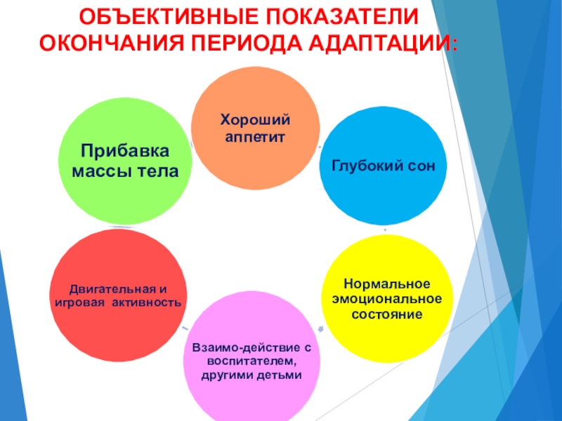 Слайд 13ОБЪЕКТИВНЫЕ ПОКАЗАТЕЛИ ОКОНЧАНИЯ ПЕРИОДА АДАПТАЦИИ: