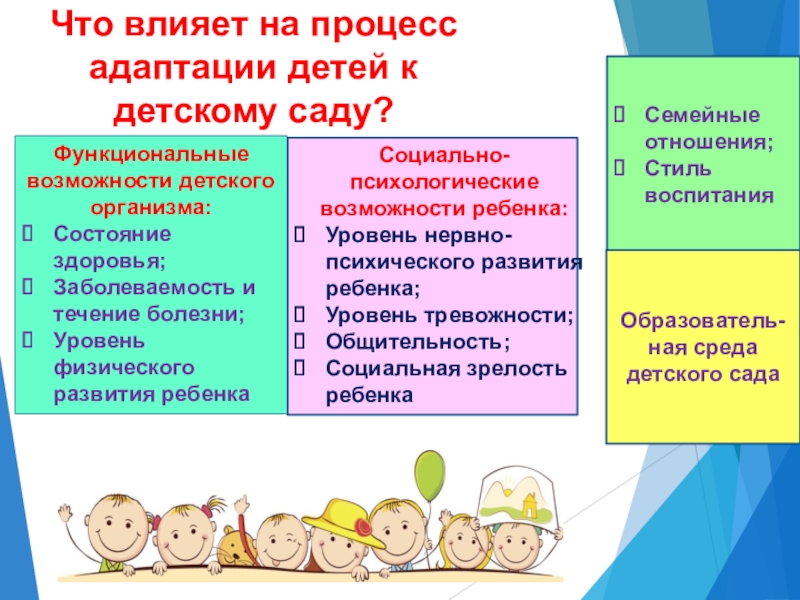 Слайд 7Что влияет на процесс адаптации детей к детскому саду?
