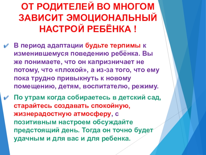Слайд 15ОТ РОДИТЕЛЕЙ ВО МНОГОМ ЗАВИСИТ ЭМОЦИОНАЛЬНЫЙ НАСТРОЙ РЕБЁНКА !