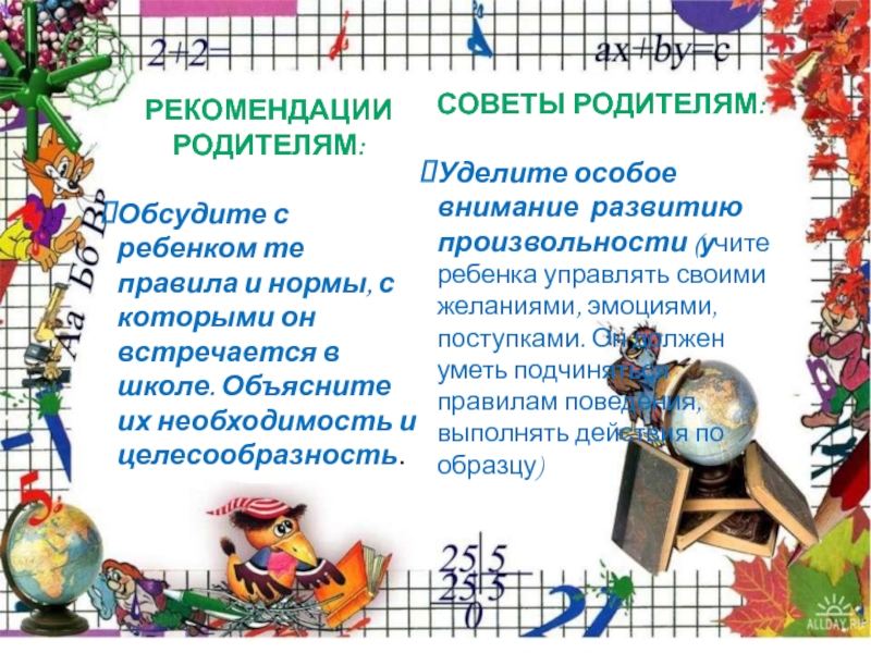 Уделите особое внимание развитию произвольности (учите ребенка управлять своими желаниями, эмоциями, поступками. Он должен уметь подчиняться правилам поведения, выполнять действия по образцу)
