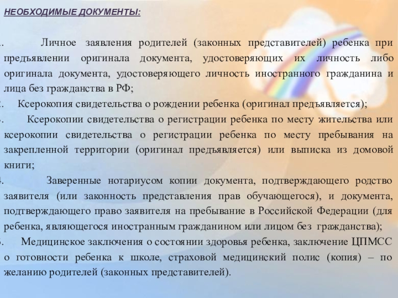 Медицинское заключения о состоянии здоровья ребенка, заключение ЦПМСС о готовности ребенка к школе, страховой медицинский полис (копия) – по желанию родителей (законных представителей).