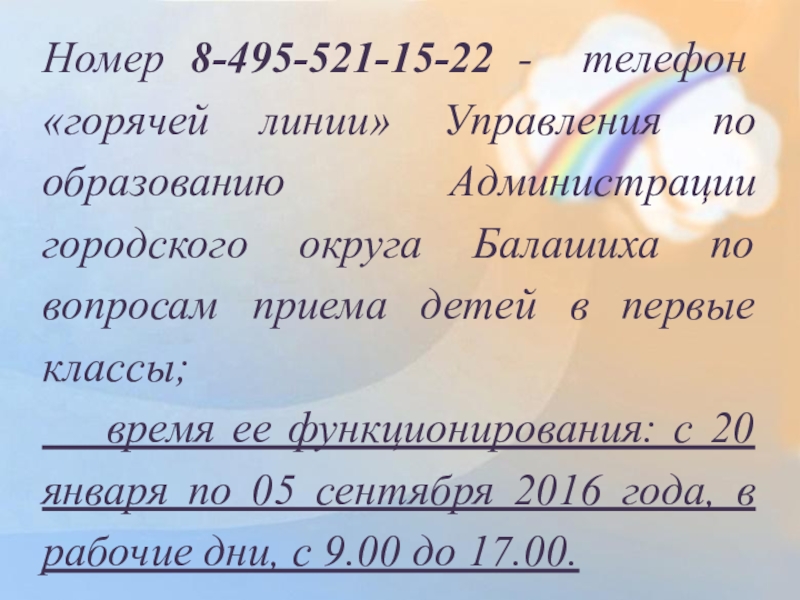 Слайд 16Номер 8-495-521-15-22 - телефон «горячей линии» Управления по образованию Администрации городского
