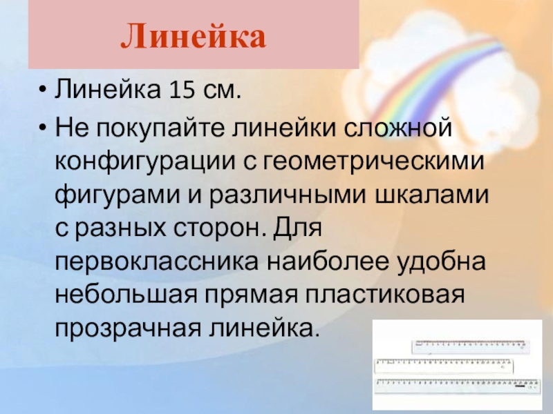 и различными шкалами с разных сторон. Для первоклассника наиболее удобна небольшая прямая пластиковая прозрачная линейка.