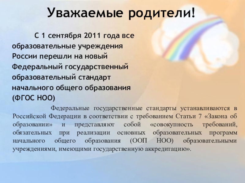 Федеральные государственные стандарты устанавливаются в Российской Федерации в соответствии с требованием Статьи 7 «Закона об образовании» и представляют собой «совокупность требований, обязательных при реализации основных образовательных программ начального общего образования (ООП НОО) образовательными учреждениями, имеющими государственную аккредитацию».