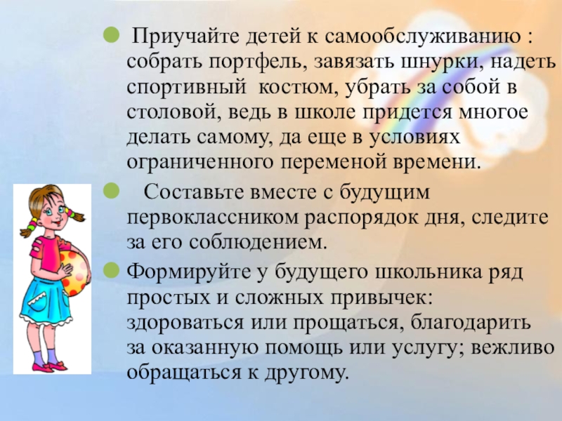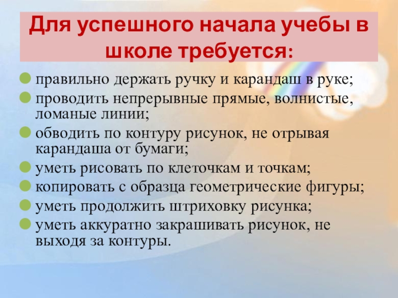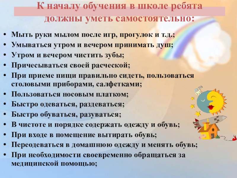 К началу обучения в школе ребята должны уметь самостоятельно: