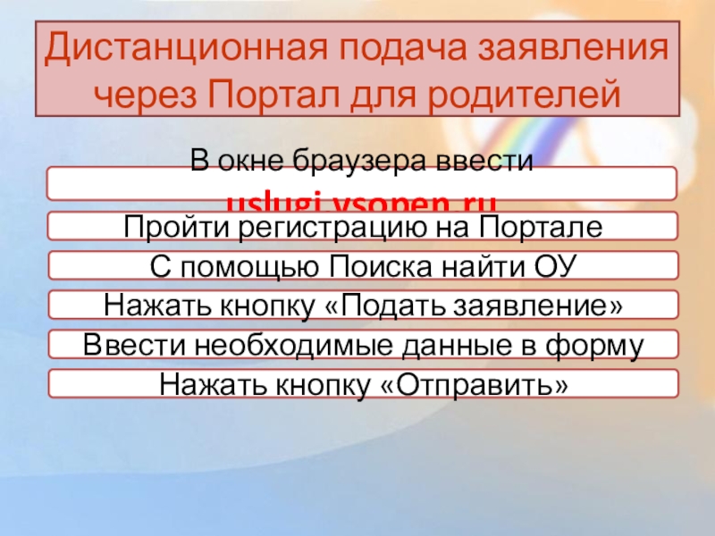 Слайд 7Дистанционная подача заявления через Портал для родителей