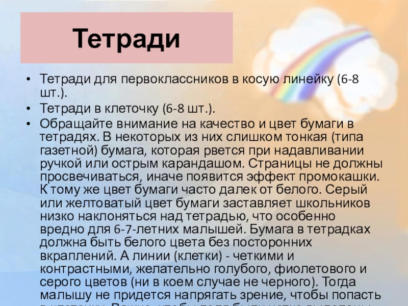 Обращайте внимание на качество и цвет бумаги в тетрадях. В некоторых из них слишком тонкая (типа газетной) бумага, которая рвется при надавливании ручкой или острым карандашом. Страницы не должны просвечиваться, иначе появится эффект промокашки. К тому же цвет бумаги часто далек от белого. Серый или желтоватый цвет бумаги заставляет школьников низко наклоняться над тетрадью, что особенно вредно для 6-7-летних малышей. Бумага в тетрадках должна быть белого цвета без посторонних вкраплений. А линии (клетки) - четкими и контрастными, желательно голубого, фиолетового и серого цветов (ни в коем случае не черного). Тогда малышу не придется напрягать зрение, чтобы попасть в клеточку. Важно, чтобы поля были четко выделены красным цветом.