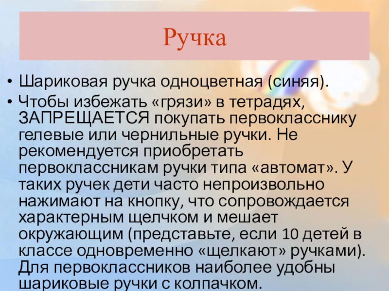 гелевые или чернильные ручки. Не рекомендуется приобретать первоклассникам ручки типа «автомат». У таких ручек дети часто непроизвольно нажимают на кнопку, что сопровождается характерным щелчком и мешает окружающим (представьте, если 10 детей в классе одновременно «щелкают» ручками). Для первоклассников наиболее удобны шариковые ручки с колпачком.