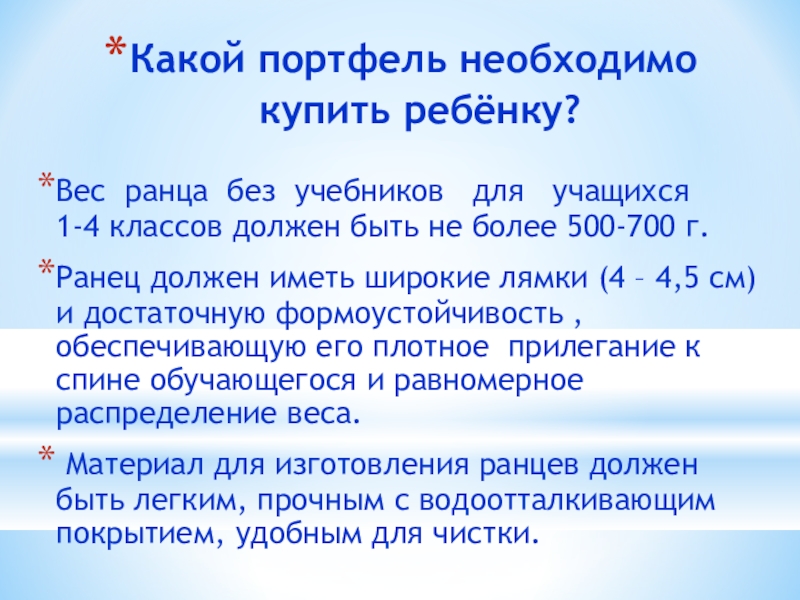 Ранец должен иметь широкие лямки (4 – 4,5 см) и достаточную формоустойчивость , обеспечивающую его плотное прилегание к спине обучающегося и равномерное распределение веса.