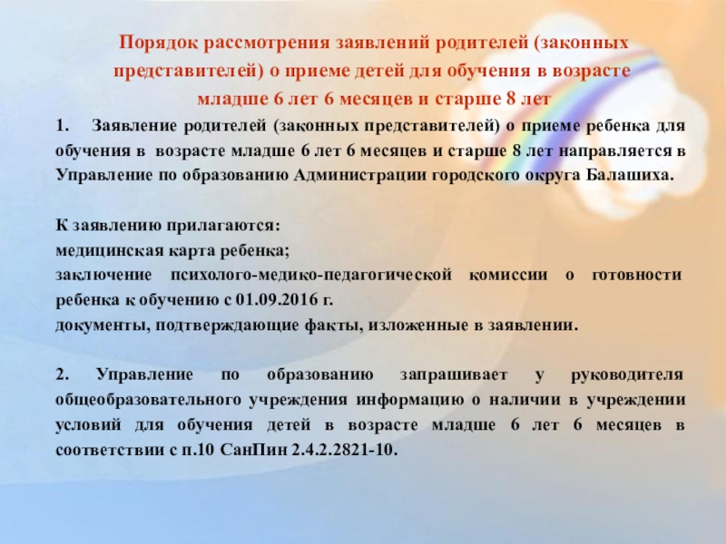 1. Заявление родителей (законных представителей) о приеме ребенка для обучения в возрасте младше 6 лет 6 месяцев и старше 8 лет направляется в Управление по образованию Администрации городского округа Балашиха.