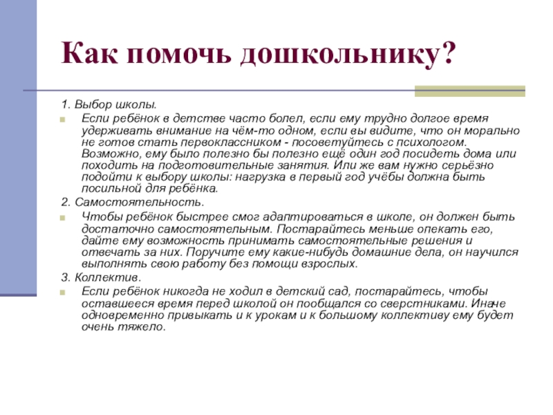 Чтобы ребёнок быстрее смог адаптироваться в школе, он должен быть достаточно самостоятельным. Постарайтесь меньше опекать его, дайте ему возможность принимать самостоятельные решения и отвечать за них. Поручите ему какие-нибудь домашние дела, он научился выполнять свою работу без помощи взрослых.