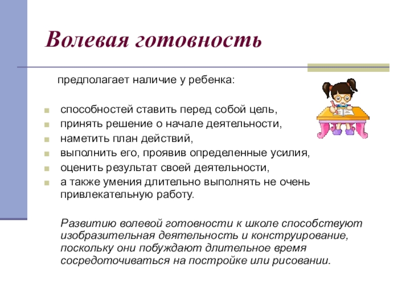 Развитию волевой готовности к школе способствуют изобразительная деятельность и конструирование, поскольку они побуждают длительное время сосредоточиваться на постройке или рисовании.