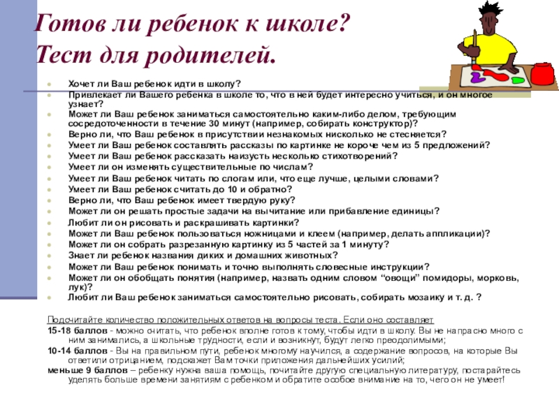меньше 9 баллов – ребенку нужна ваша помощь, почитайте другую специальную литературу, постарайтесь уделять больше времени занятиям с ребенком и обратите особое внимание на то, чего он не умеет!