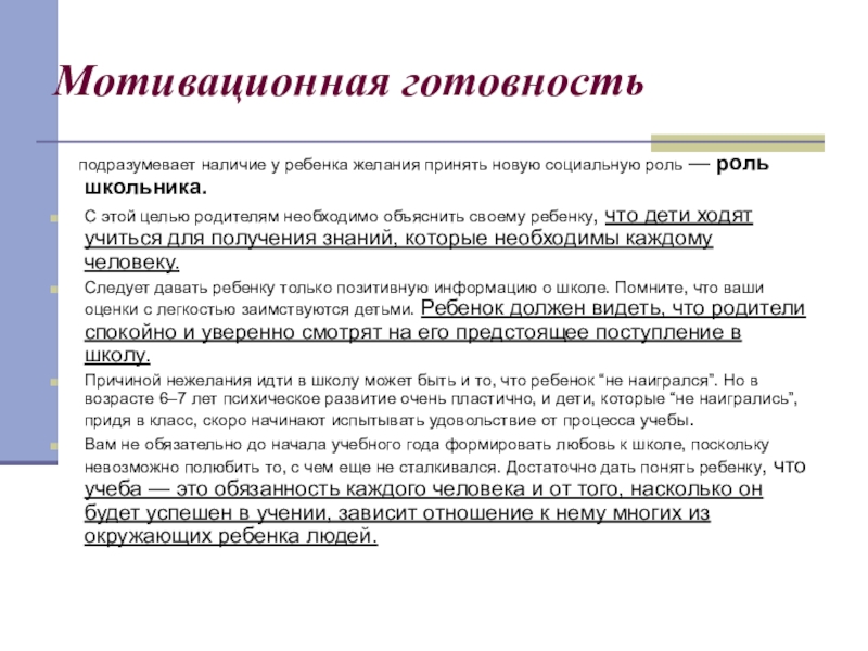 Причиной нежелания идти в школу может быть и то, что ребенок “не наигрался”. Но в возрасте 6–7 лет психическое развитие очень пластично, и дети, которые “не наигрались”, придя в класс, скоро начинают испытывать удовольствие от процесса учебы.