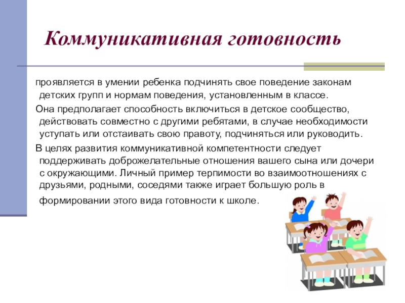 В целях развития коммуникативной компетентности следует поддерживать доброжелательные отношения вашего сына или дочери с окружающими. Личный пример терпимости во взаимоотношениях с друзьями, родными, соседями также играет большую роль в формировании этого вида готовности к школе.