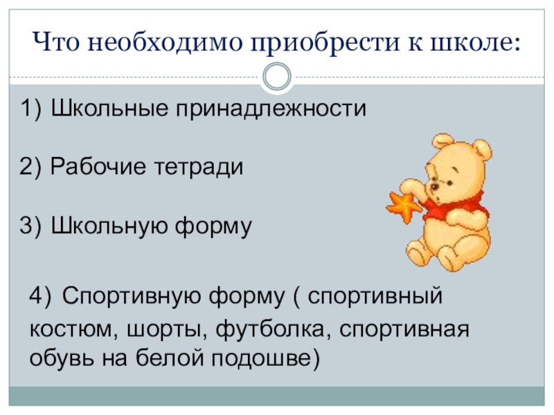Что необходимо приобрести к школе: Школьные принадлежности Рабочие тетрадиШкольную форму4) Спортивную форму ( спортивный костюм, шорты, футболка,