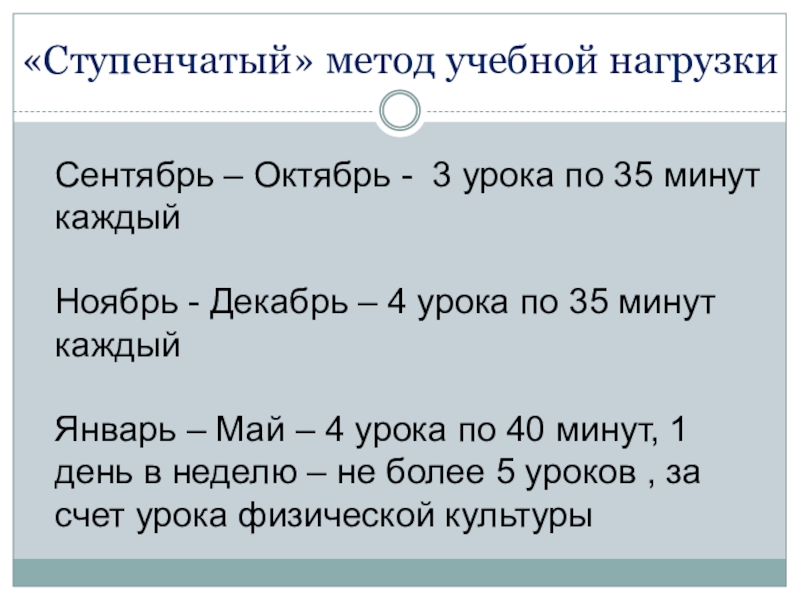 «Ступенчатый» метод учебной нагрузки  Сентябрь – Октябрь - 3 урока по 35 минут каждый Ноябрь -