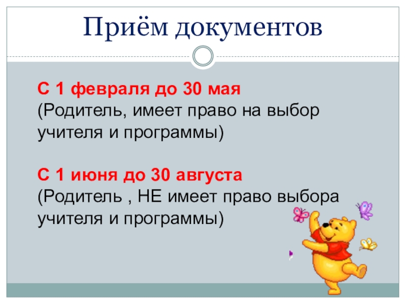 Приём документов С 1 февраля до 30 мая(Родитель, имеет право на выбор учителя и программы)С 1 июня