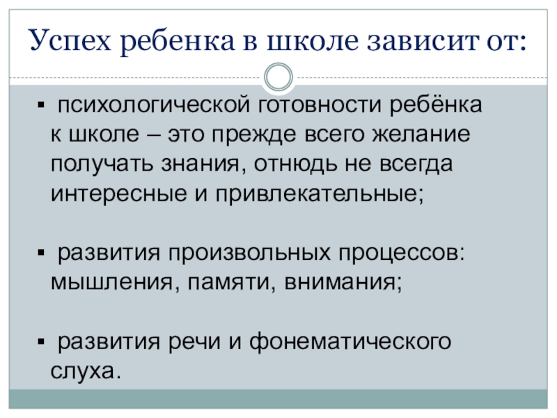 Успех ребенка в школе зависит от: психологической готовности ребёнка к школе – это прежде всего желание получать