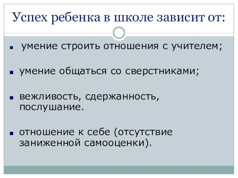 Успех ребенка в школе зависит от: умение строить отношения с учителем; умение общаться со сверстниками; вежливость, сдержанность,